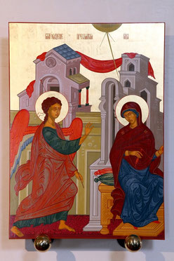 Ricevuto il comando d'amore per l'uomo, l'angelo Gabriele si affretta a presentarsi alla Vergine. Impugna con la mano sinistra un lungo bastone, simbolo dell'autorità e dignità del messaggero. Le sue dita sono disposte nel gesto tipico bizantino della benedizione carica di simbologia: le tre dita aperte - indice, medio e mignolo - vogliono ricordare la Trinità, e che il Cristo è una delle tre persone divine. Le due dita ripiegate ricordano che in Cristo sussistono due nature, quella umana e quella divina.