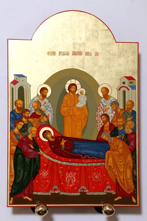 Nell 'iconografia orientale, il tipo classico della Dormizione rappresenta la Madre di Dio distesa sul letto funebre, circondata dagli apostoli, e il Cristo in gloria - centro dell'icona -, che riceve fra le braccia l'anima della Madre.